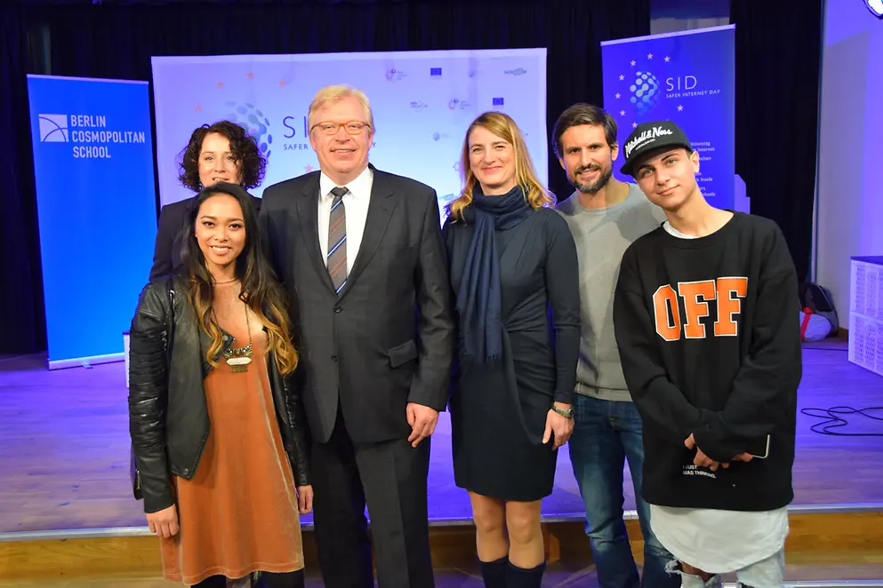 Die Schülerinnen und Schüler der Berlin Cosmopolitan School stellten sich die Frage "Alles unter Kontrolle?!" auch ganz selbstkritisch. Gemeinsam mit Staatssekretär Dr. Ralf Kleindiek, Schauspieler Tom Beck, YouTuberin Hello Chrissy und Sänger Lukas Rieger diskutierten sie über einen sicheren Umgang mit Apps und Onlinespielen sowie einen besseren Jugendmedienschutz.